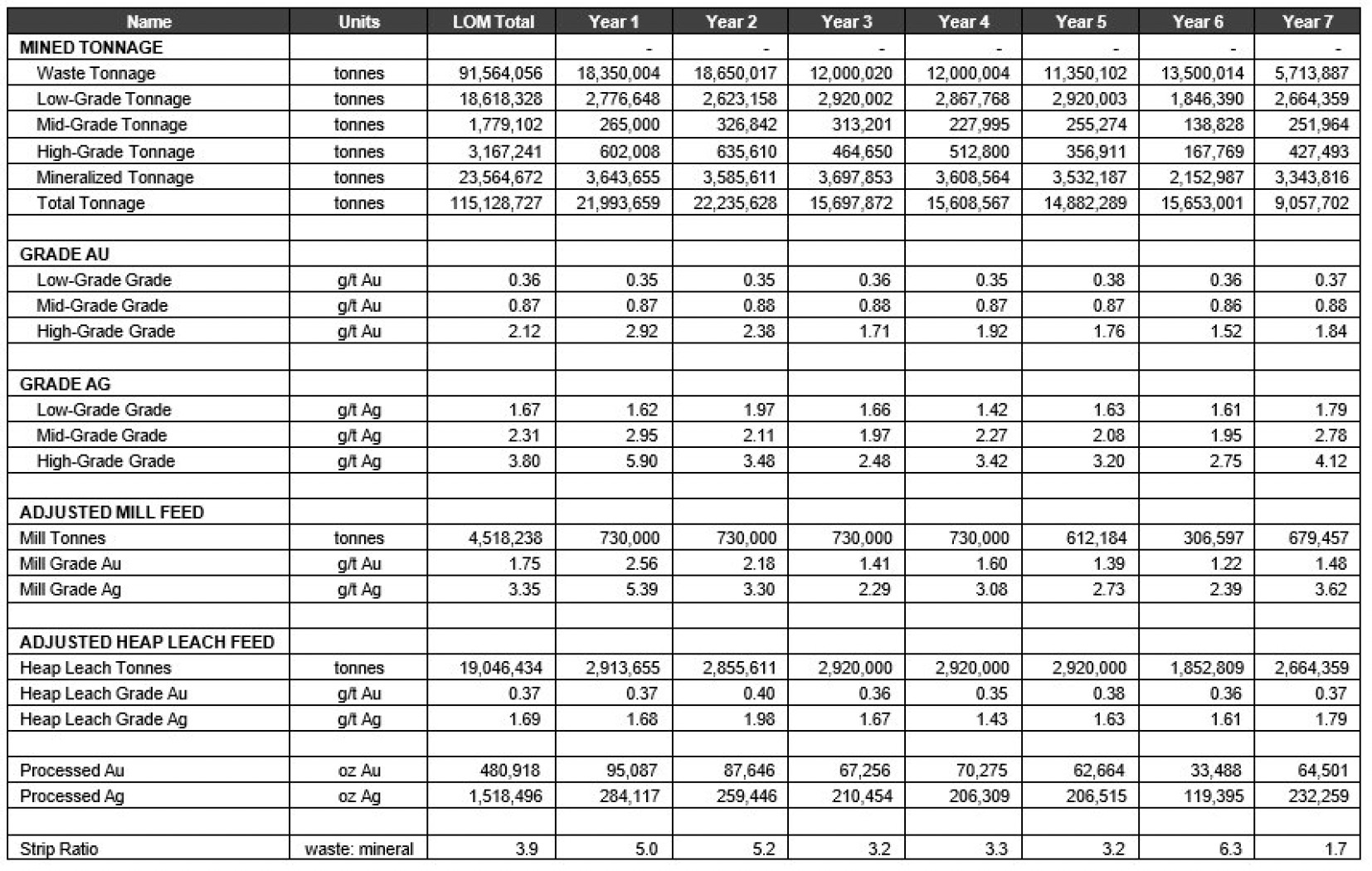 - Variable recoveries for Au and Ag based on head grade and material type with an overall Au recovery of 76% for grades of 0.5 g/t or less for both volcanic and argillic material types and Ag recoveries of 15% and 19% for Ag grades of 1.0 g/t or less for argillic and volcanic material, respectively