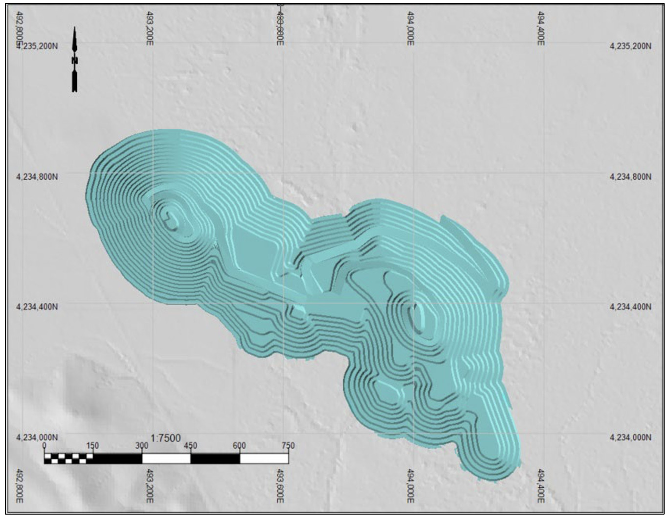 The mine design features three pit phases, each tailored to prioritize higher-grade material early and manage pre- stripping efficiently. Access and haul roads, ramp geometry, and bench configurations were optimized for 100-ton class equipment, maintaining safety and operational efficiency. Waste rock storage was strategically planned to accommodate both current and future needs. Approximately 16% of waste rock was planned to dump within the pit, a strategic move that significantly reduced costs as the mine approached closure.