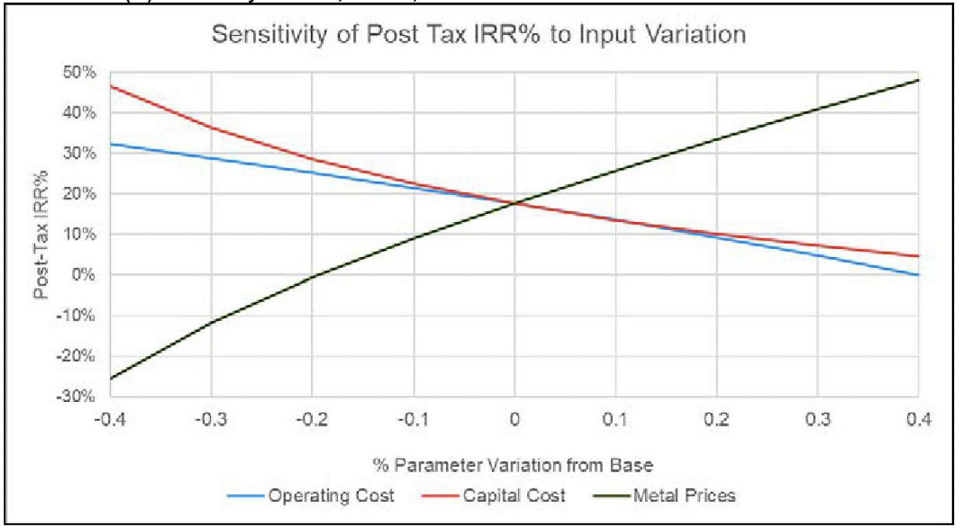 The post-tax results of the sensitivity analysis are shown in the following Figures. The NPV of the project is most sensitive to changes in the metal prices and OPEX, while the IRR is most sensitive to changes in the metal prices and CAPEX.
